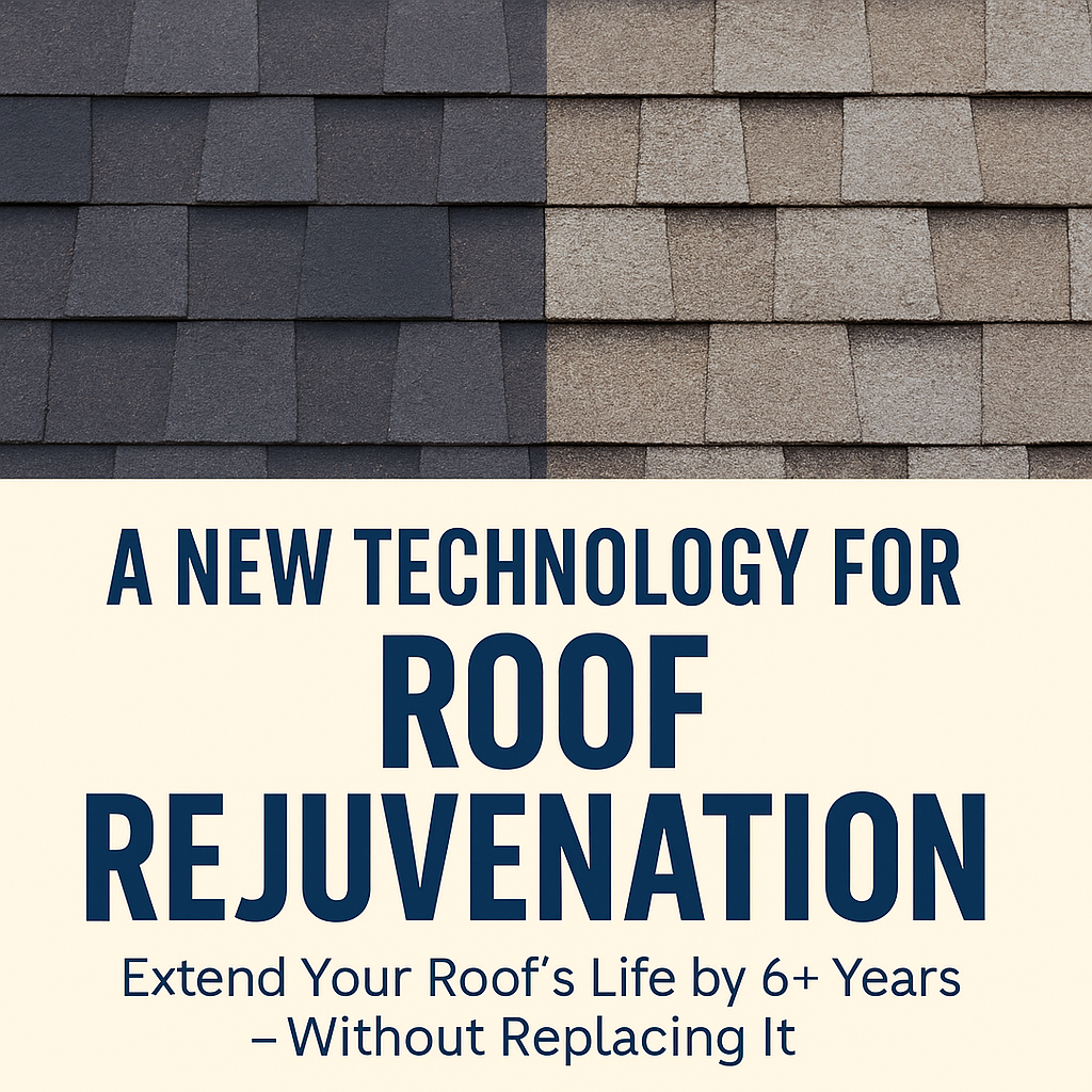 Roof rejuvenation is a scientifically engineered process that restores lost oils in asphalt shingles — the same natural oils that keep your roof flexible and waterproof when it’s new.