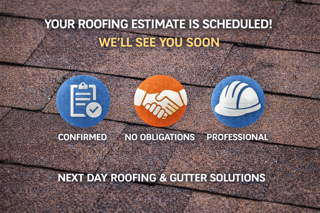 Thank you for scheduling your free, no-obligation roofing estimate with Next Day Roofing & Gutter Solutions. We appreciate the opportunity to help protect your home and look forward to meeting you soon.