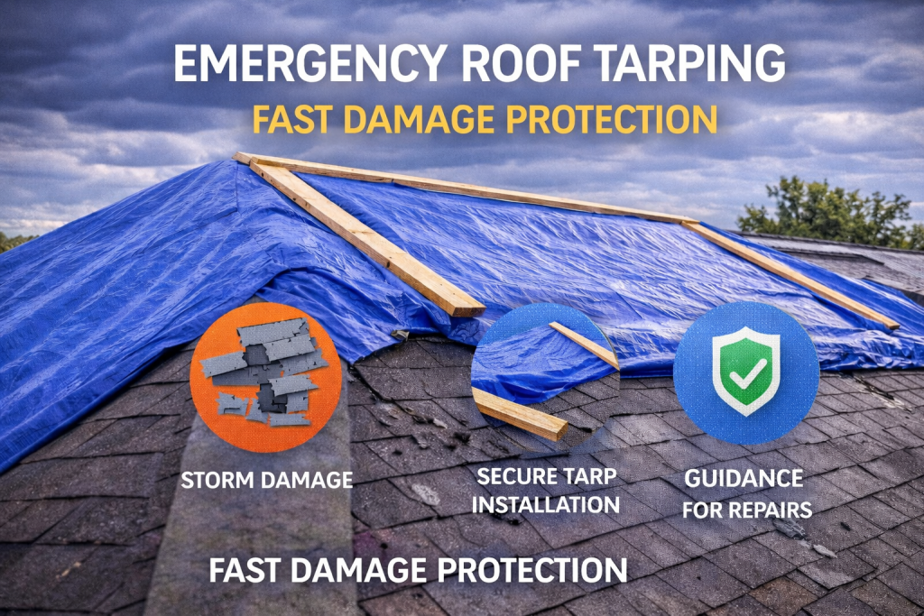 Emergency roof tarping is a temporary protective service that involves securely installing a heavy-duty tarp over damaged or exposed areas of a roof. The goal is to prevent additional water intrusion and interior damage following sudden roof failure.