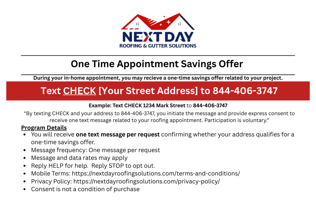 Next Day Roofing & Gutter Solutions offers a one-time appointment savings offer via text message during scheduled in-home roofing appointments.